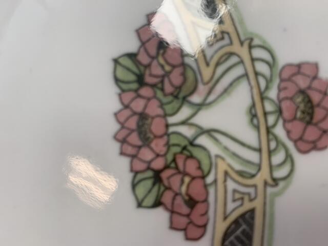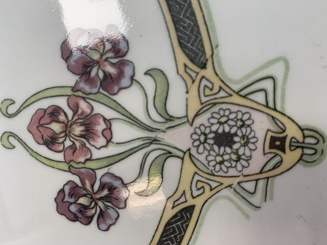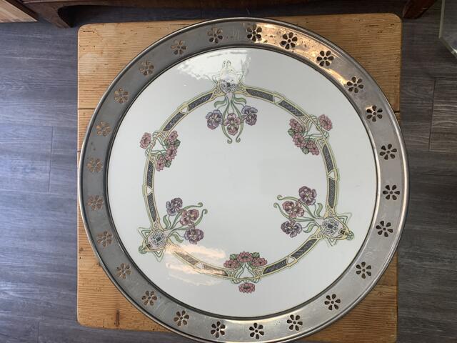 Jugendstil Keramikplatte mit durchbrochenem Metallrand